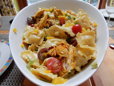 5. Taillez les escalopes de poulet en lamelles, ajoutez-les dans le saladier ainsi que les pâtes.