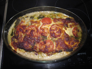 Tapissez-la de pesto et de tomates. Parsemez de mozzarella râpée.